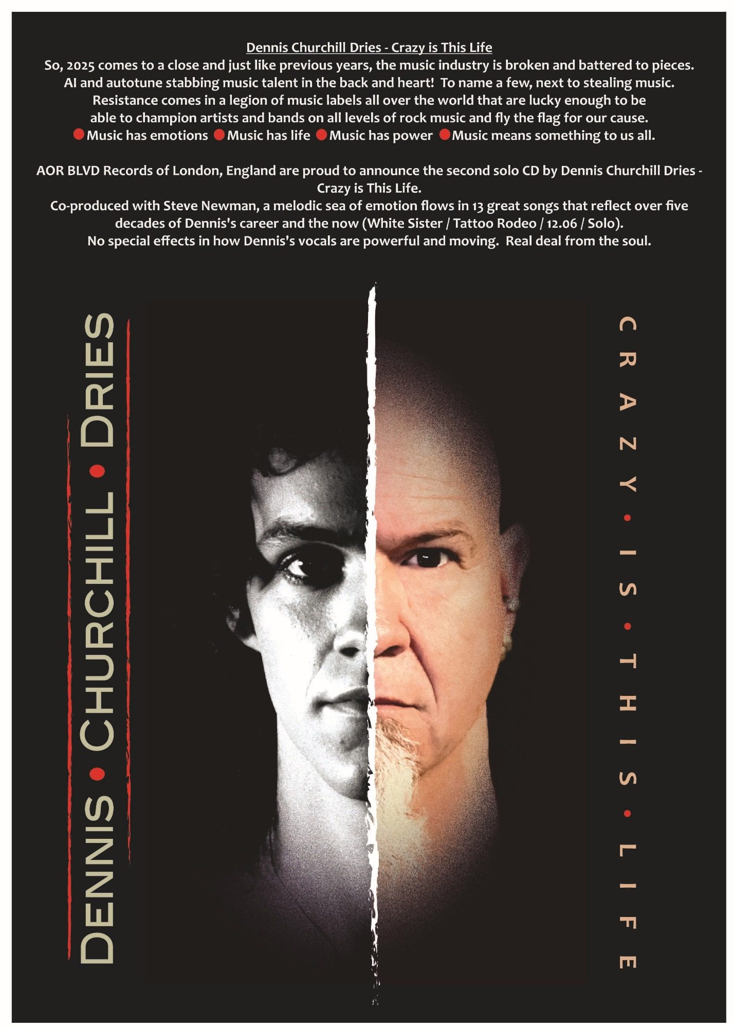 The new album from Dennis Churchill Dries, Crazy Is This Life, released February 2026 by AORBLVDRecords.